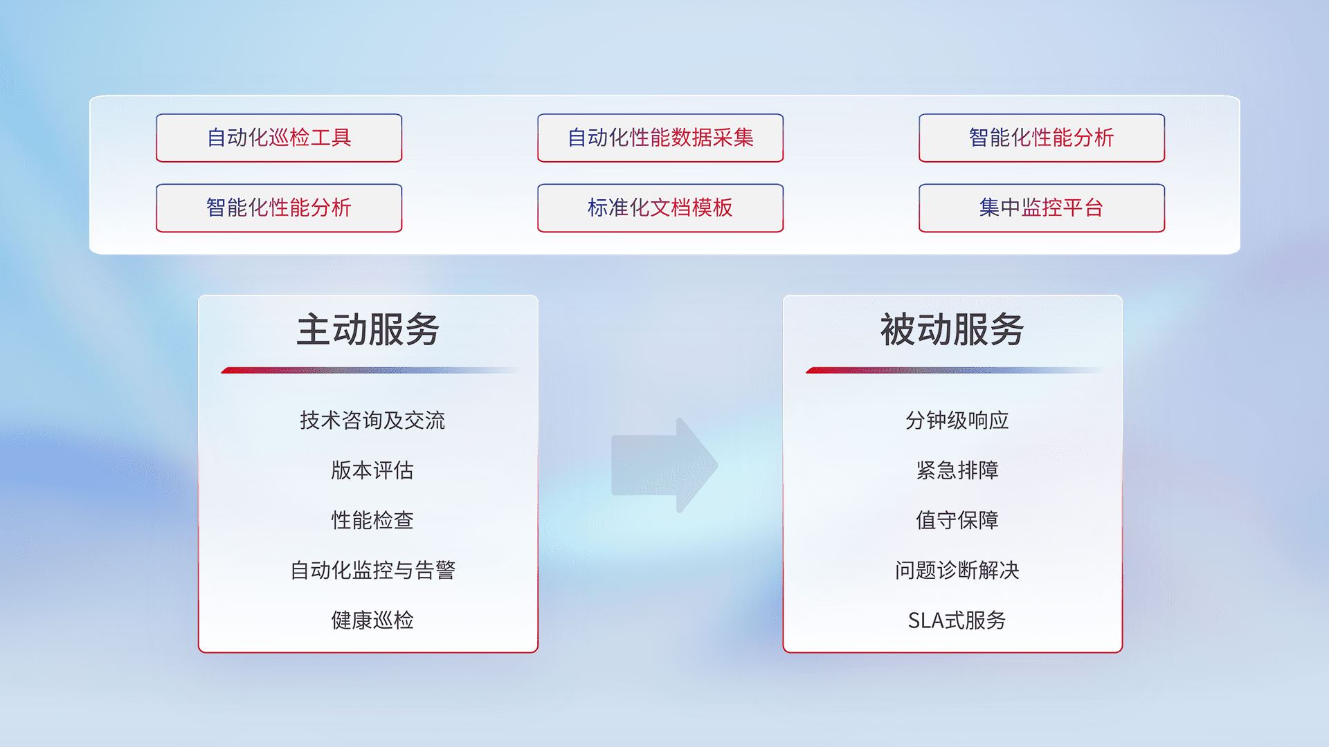 智能化工具和标准化文档,,,,保障服务质量,,提供主动服务(包含技术咨询、、、、版本评估、、、、性能检查、、自动化监控与告警、、健康巡检)和被动服务包含(分钟级响应、、紧急排障、、、、值守保障、、问题诊断解决、、、SLA服务)。。。。