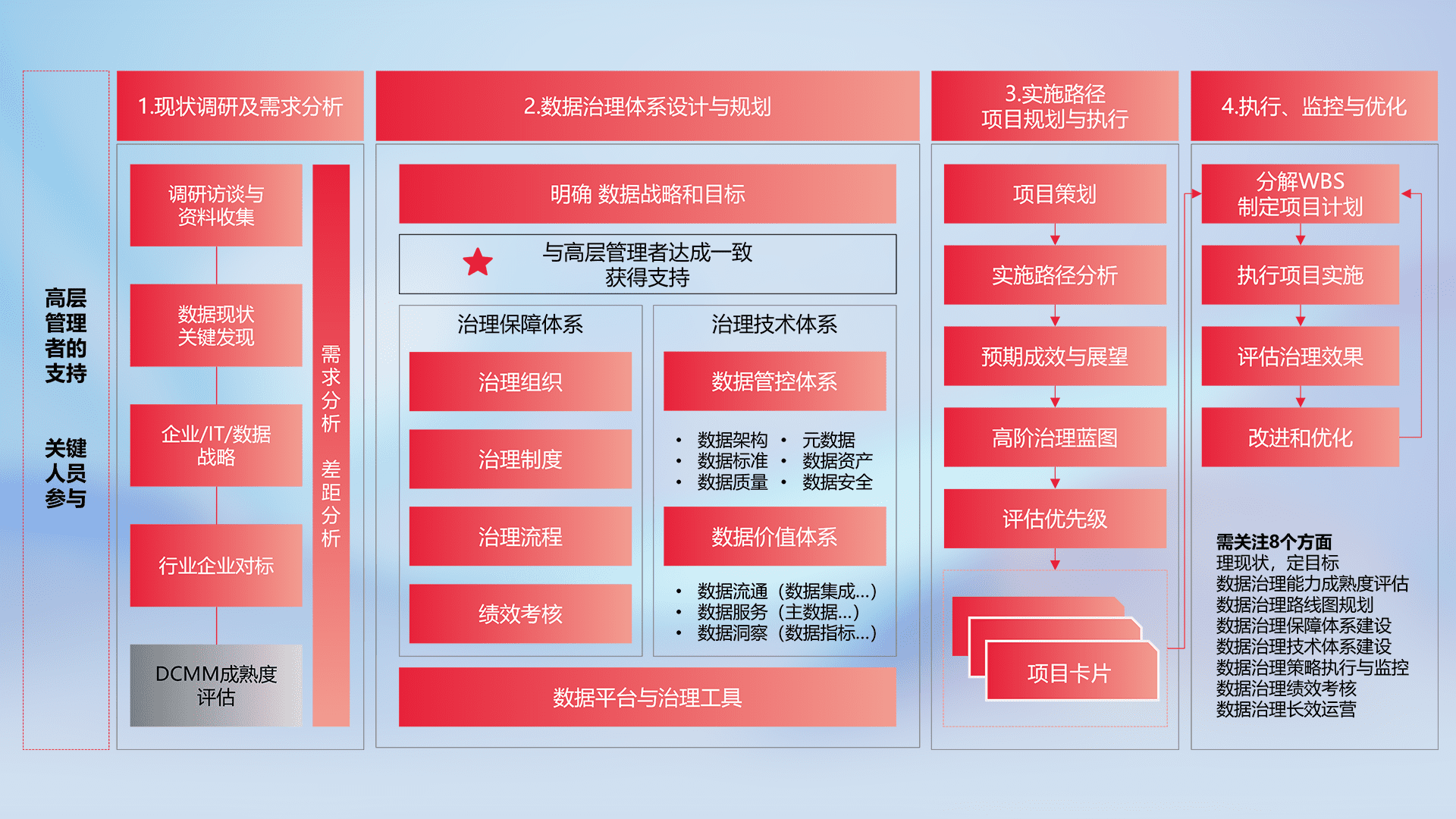 制定并执行统一的数据标准,,,,规范数据定义和格式,,,,消除冗余和不一致性,,,实现跨部门和跨系统的数据一致性,,,,为企业提供标准化的数据基础。。
